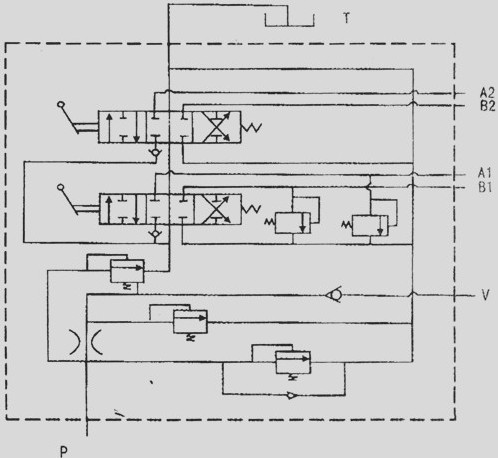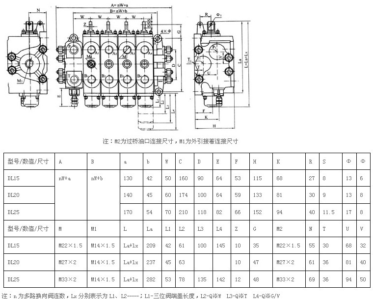 用途与性能 D(F)L系列多路换向阀具有工作压力高、结构紧凑、压力损失小、通用性强、微调性能及溢流阀启闭性好。每联带有单向阀,可以防止油液倒流等特点。本阀主要用于ZL40以下装载机以及小型挖掘机等工程机械的液压系统中。 本阀可组成并联、串联、串并联及复合式多种油路。可在任一联上的任一腔品插过载阀和补油阀,并可根据主机械的液压转向需要在进油体上自带稳定分流阀。 型号说明 原理图 外形安装连接尺寸