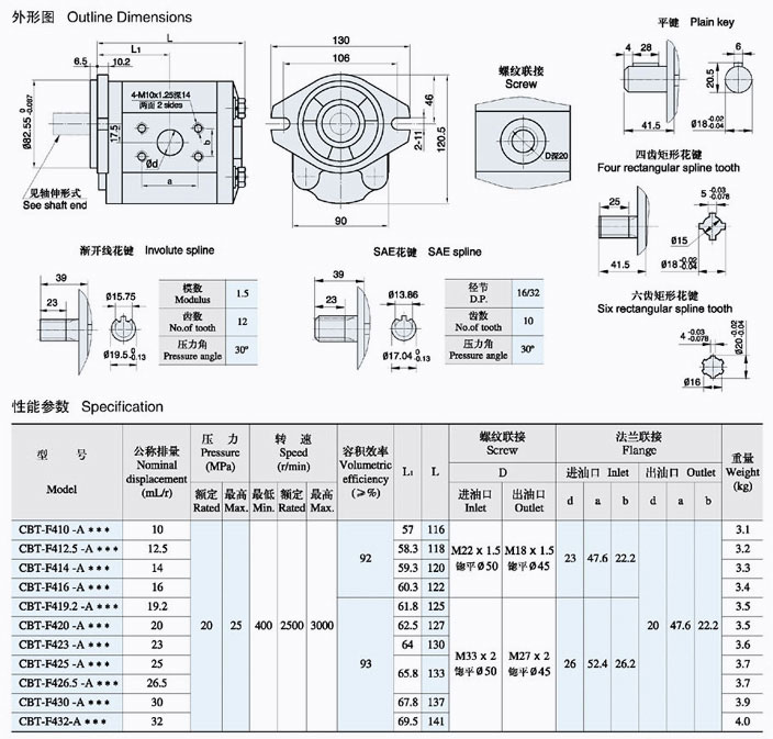 产品特点 ★ 高强度铝合金壳体 ★ 输入轴联接形式有平键、矩形花键、渐开线花键、SAE渐开线花键 ★ 进、出油口联接形式有螺纹、法兰等可供选择 ★ 轴向间隙自动补偿机构,使油泵能够长期保持高效率工作 ★ 工作压力高,转速范围广,低转速达400rpm时仍能保持高容积效率 型号说明 ① 产品代号 Product code ② 压力等级 Pressure grade F: 20MPa ③ 齿轮模数 Gear modulus 4 ④ 公称排量 Nominal displacement (mL/r) ⑤ 安装形式 Mounting A: 菱形法兰 Oval ⑥ 油口形式 Joining port F: 法兰联接 Flange L: 螺纹联接 Screw ⑦ 轴伸形式 Shaft end P: 平键 Plain key Φ: SAE花键 SAE spline H: 矩形花键 Rectangle spline ⑧ 旋 向 Rotation L: 左旋 Left (逆时针 Counterclockwise) R: 右旋 Right (顺时针 Clockwise is omitted) (省略) 技术参数